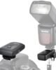 Insert the transmitter’s hot shoe socket into your camera’s hot shoe jack, plug the flash onto the receiver, and switch ON the receiver. Make sure the channel selector of both transmitter and receiver at same channel. Press the Test button on the transmitter to test before shooting.
